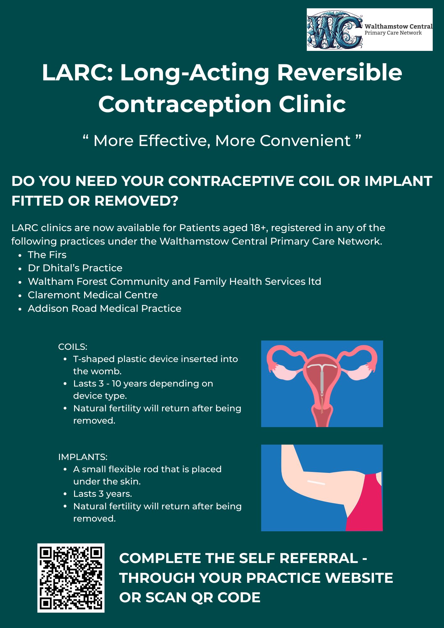 Long-acting reversible contraception clinic for coil or implant fitting and removal.